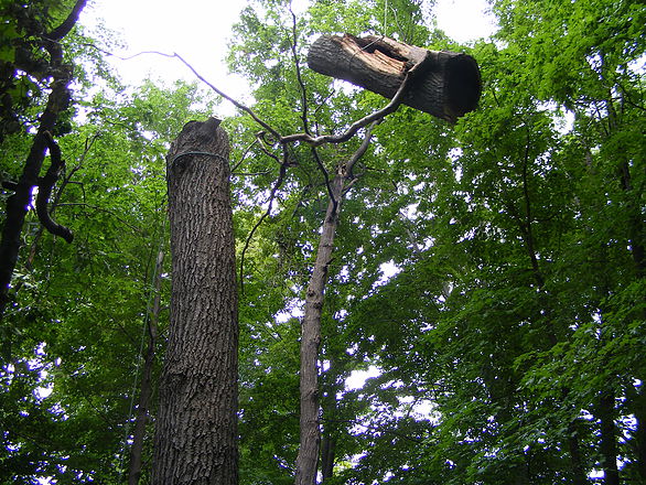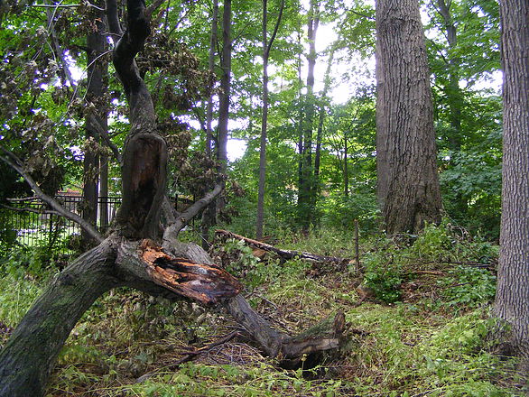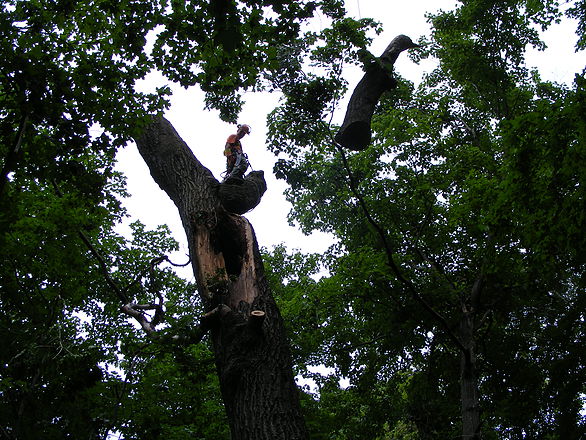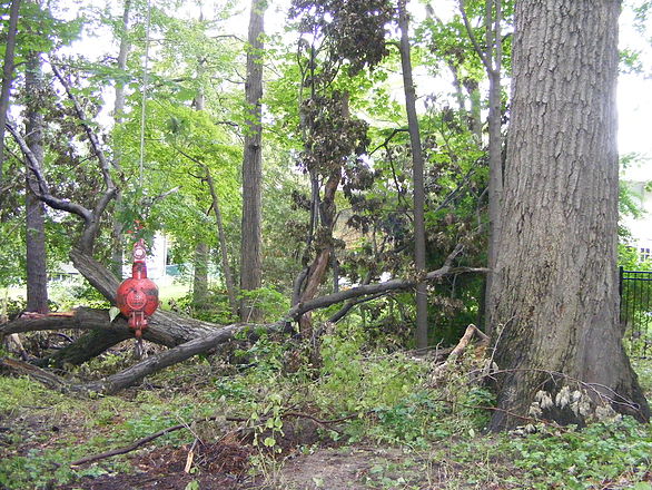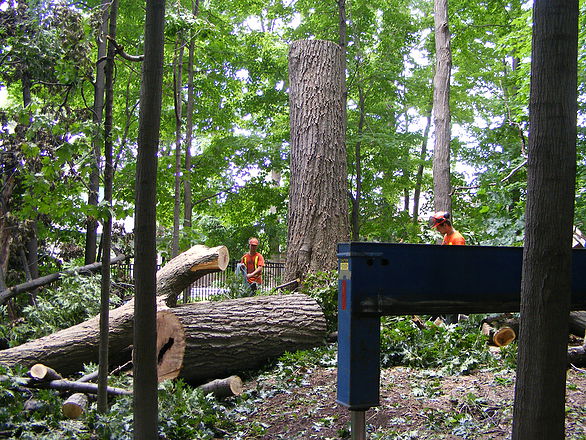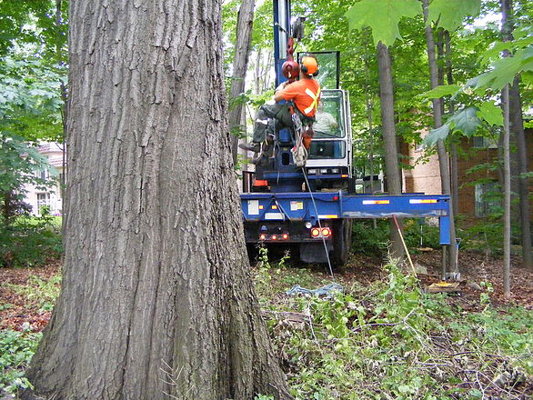 This massive Oak tree was on the original property of Sir William Pierce Howland (Thorncrest Village, Etobicoke), one of Canada’s father’s of confederation, as the local folk lure has it, the entire sub-division was built on what was once Sir William’s farm. He loved Oak trees and planted them on all the fence rows. Unfortunately this 185 year-old Oak developed a massive cavity and 1/3 of canopy failed in wind storm crushing two fences and a neighbour’s pool. The only safe way to remove this rotten tree was to utilize a crane to suspend a climber and pick down pieces. Unfortunately this Oak was located in the back corner of the property so we had to remove two trees and dismantle a fence to gain access.